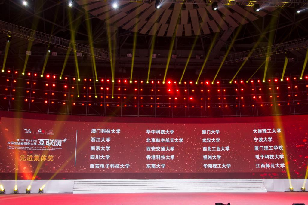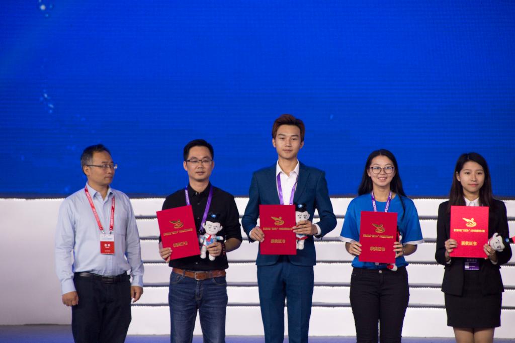 我校银奖项目“全球领先的智慧城市交通解决方案提供商”上台领奖(左三)
