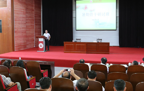 7月10日至11日,为期两天的2017年暑期骨干学习研讨班在教学楼学术报告厅举行。全体校领导、中层干部、教授、党外代表人士、特邀人员、中青年骨干教师代表等共266人参加了学习研讨,研讨班报告会由校党委李泽彧副书记主持。本次研讨班紧扣深入学习贯彻习近平总书记系列重要讲话和厦门市委市政府领导对我校工作的重要批示精神,结合“两学一做”学习教育常态化制度化和全省高校思想政治工作会议精神,以“产学融合显特色,评建结合强内涵”为主题,围绕产学融合、申硕、本科教学工作审核评估等议题展开,通过主报告、专题报告、大会交流等形式,进一步明确目标,深化认识,凝聚共识,圆满完成了既定的各项学习研讨任务。