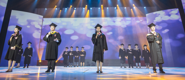上午9时,艺术会堂座无虚席,来自不同岗位教职员工通过视频向毕业生们送出了祝福。在校铜管乐团演奏的悠扬乐曲声里,2017届毕业典礼正式开始。伴随着《不说再见》的旋律,大屏幕上一帧帧闪过大学四年的珍贵记忆,娓娓道来的回顾视频勾起了毕业生们的无限思绪。