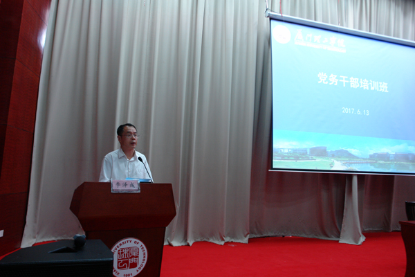 连日来,我校举办的党务干部培训班利用两个单位乐动网页版集中学习培训,全体党务干部认真开展学习研讨。6月13日下午,培训班邀请厦门市纪委政策法规研究室谢国辉主任为全体学员作了党规党纪方面的专题讲座。谢国辉主任从新修订的《中国共产党廉洁自律准则》(以下简称《准则》)和《中国共产党纪律处分条例》(以下简称《条例》)的修订背景、过程及意义、新特点、新要求、主要内容等几个方面,帮助大家进一步理解把握党员和党员领导干部道德的高标准及党组织和党员不可触碰的行为底线。他强调要从全面从严治党的政治高度加强对《准则》和《条例》的学习贯彻和落实,切实把纪律和规矩挺在前面,牢固树立党章党规党纪意识,党员领导干部要带头践行廉洁自律规范,自觉维护纪律的严肃性和权威性。
