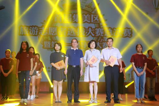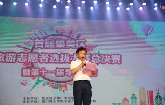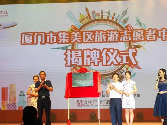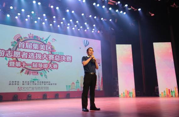 6月7日下午,首届集美区旅游志愿者选拔大赛总决赛暨第十一届导游大赛在艺术会堂举行,集美区旅游志愿者中心同时揭牌成立。此次活动由厦门集美区文体广电出版旅游局主办,我校文化产业与旅游学院承办,集美大学工商管理学院旅游管理系、厦门城市职业学院旅游系、厦门工商旅游学校、厦门华厦学院和厦门软件职业技术学院协办。集美区文体广电出版旅游局吴吉堂局长、我校尤国顺副校长、文化产业与旅游学院院长罗昌智、学院党委书记袁雅琴等领导嘉宾以及参赛学校师生代表参加活动。